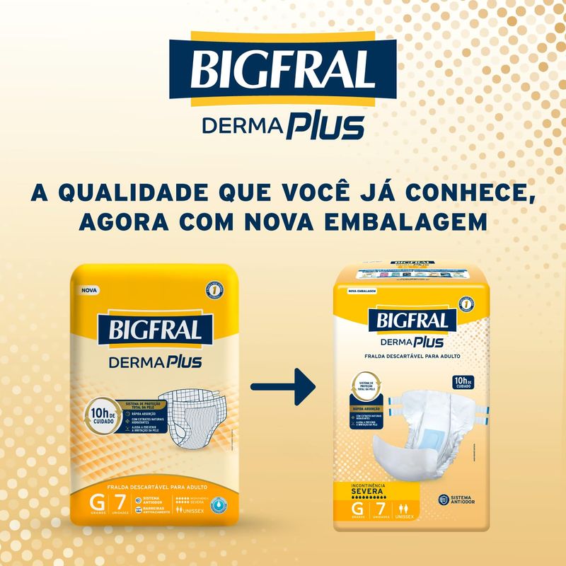 Bigfral DermaPlus é a primeira fralda para adultos com extratos naturais hidratantes, que ajudam a previnir irritações, mantendo a pele protegida e saudável, além de garantir até 10h de cuidado para pessoas com incontinência urinária severa. O Sistema Antiodor neutraliza odores, trazendo a sensação de frescor da pele.
