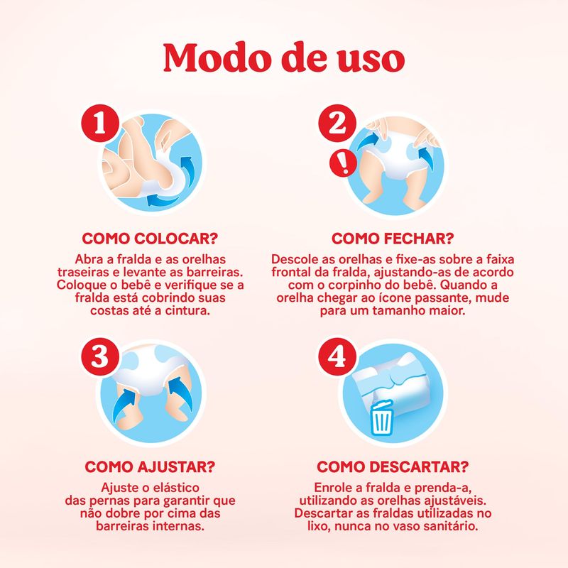 4) Enrole a fralda e prenda-a, utilizando as orelhas ajustáveis. Descartar as fraldas utilizadas no lixo, nunca no vaso sanitário.