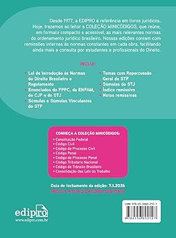 Desde 1977, a EDIPRO é referência em livros jurídicos. Hoje, trazemos ao leitor a COLEÇÃO MINICÓDIGOS, que reúne, em formato compacto e acessível, as mais relevantes normas do ordenamento jurídico brasileiro. Nossas edições contam com remissões internas às normas constantes em cada obra, facilitando ainda mais a consulta por estudantes e profissionais do Direito. INCLUI: