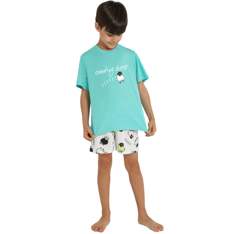 Short infantil com estampa de várias ovelhinhas, visual lúdico e encantador.