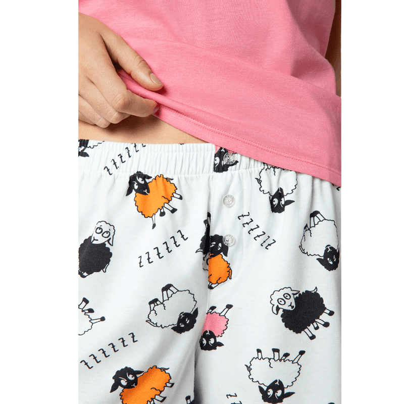 Blusa de manga curta com estampa central de uma ovelha fofa. Short curto com estampa de várias ovelhas, trazendo harmonia ao conjunto. Cós com elástico embutido, garantindo ajuste confortável ao corpo. Tecido leve, macio e respirável. Conjunto divertido e confortável.