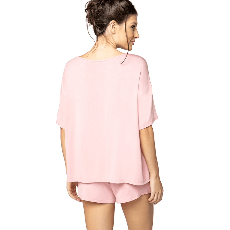 Blusa de manga curta ampliada, com modelagem mais larguinha e caimento leve.